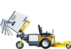 The Walker Hi-Dump® raises up 67 inches and dumps collected grass and debris into a truck or trailer. Powered by a 12-volt electric/hydraulic system, the lifting and dumping functions work independently and are controlled by two toggle switches near the operator’s seat.